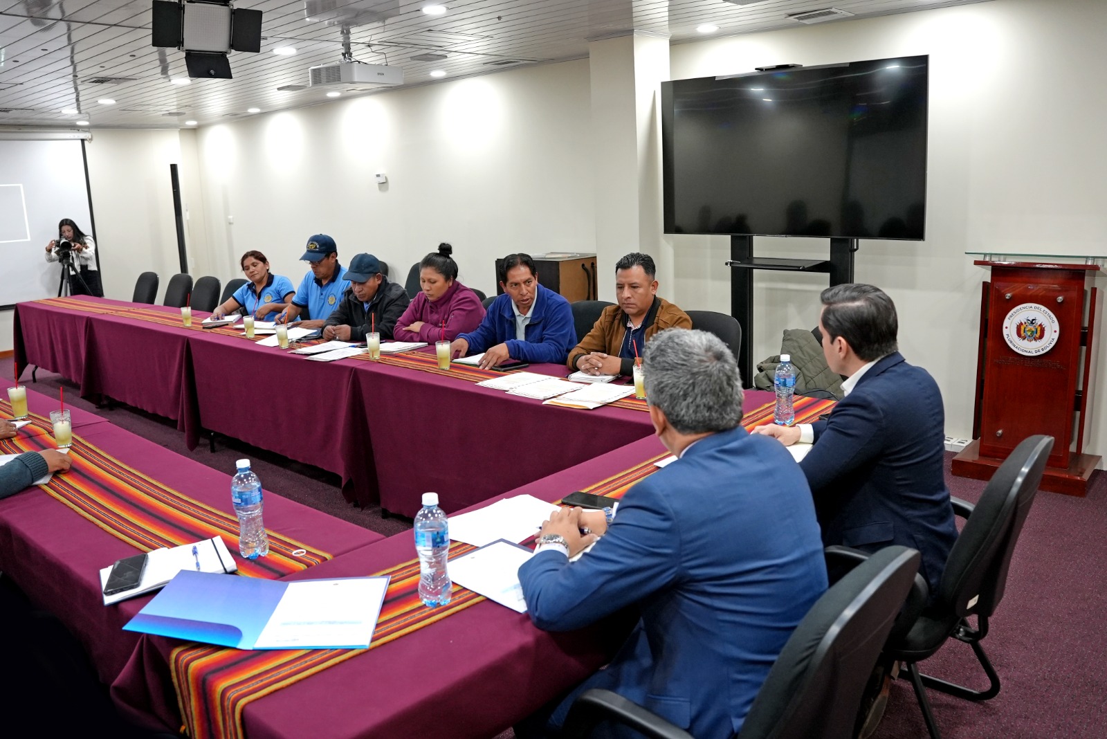 La Paz, 15 de diciembre (MDPRyA). – El Ministerio de Desarrollo Productivo, Rural y Aguas, representado por el Viceministro de Comercio y Logística Interna, Gustavo Serrano Osorio y el Gerente General de EMAPA, Sergio Siles Sánchez sostuvieron una importante reunión con los representantes del sector panificador.